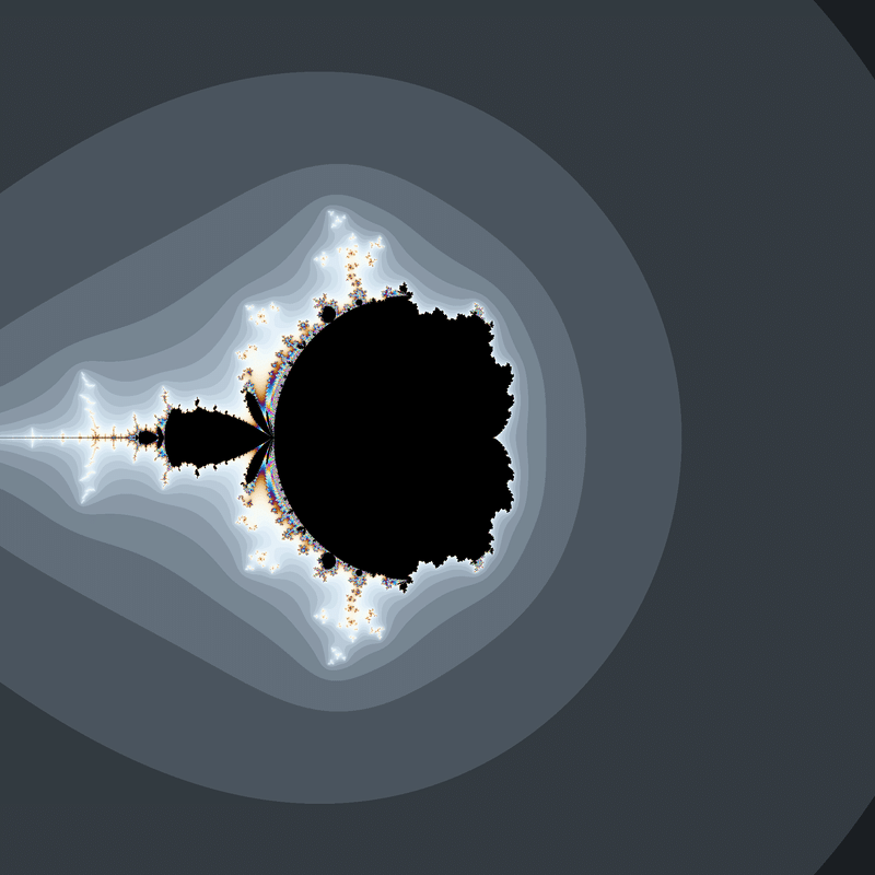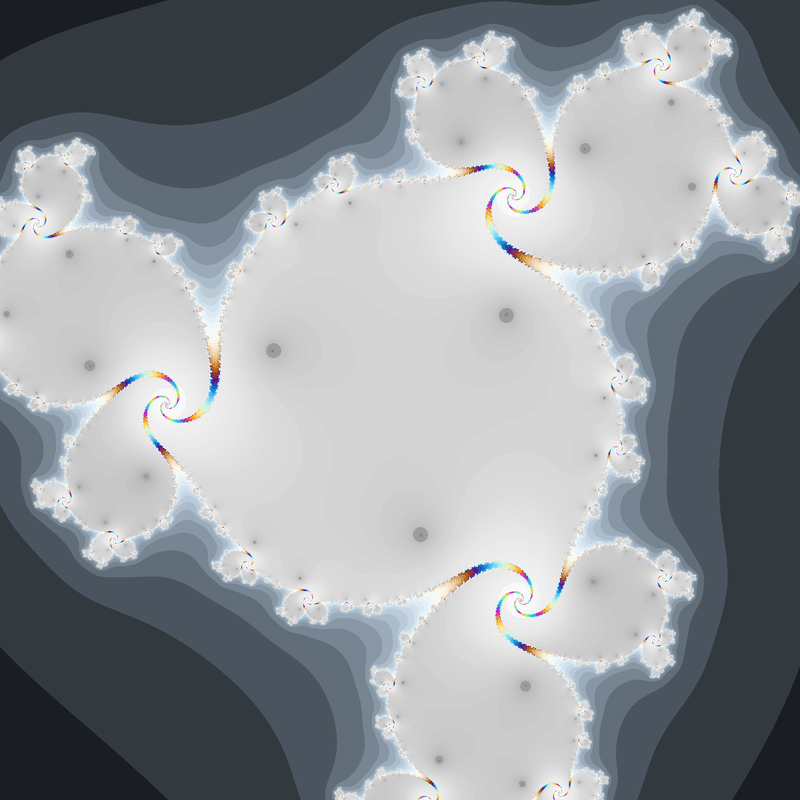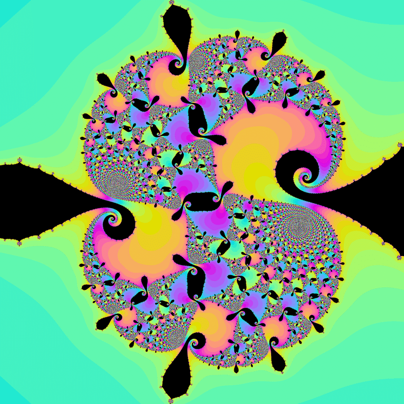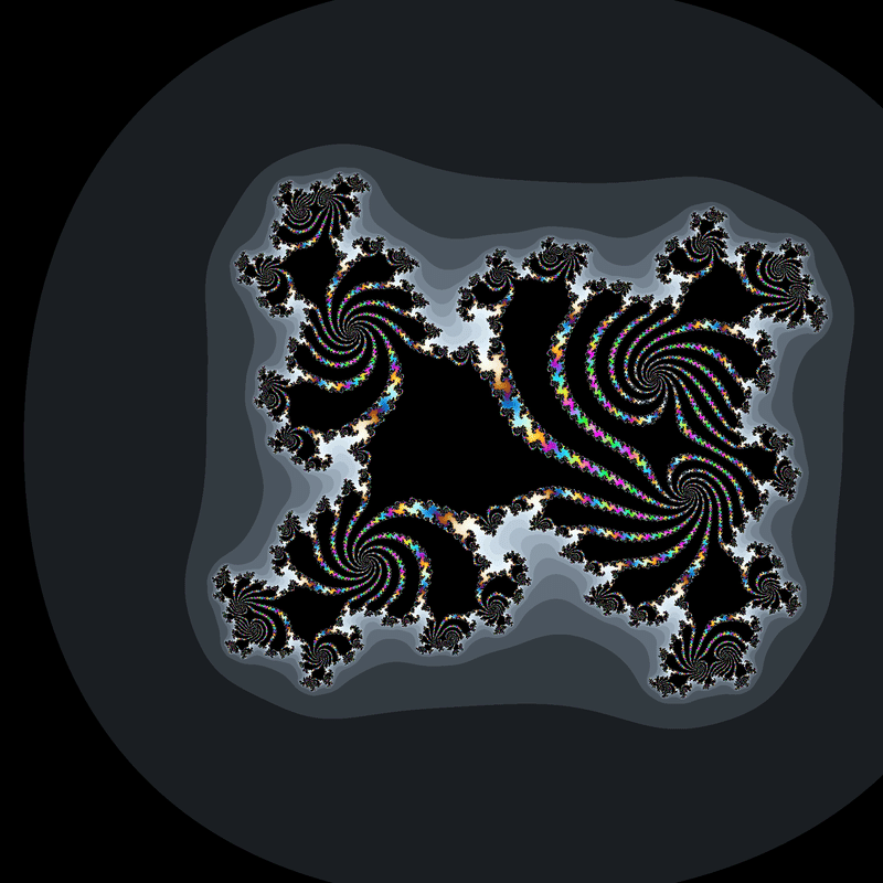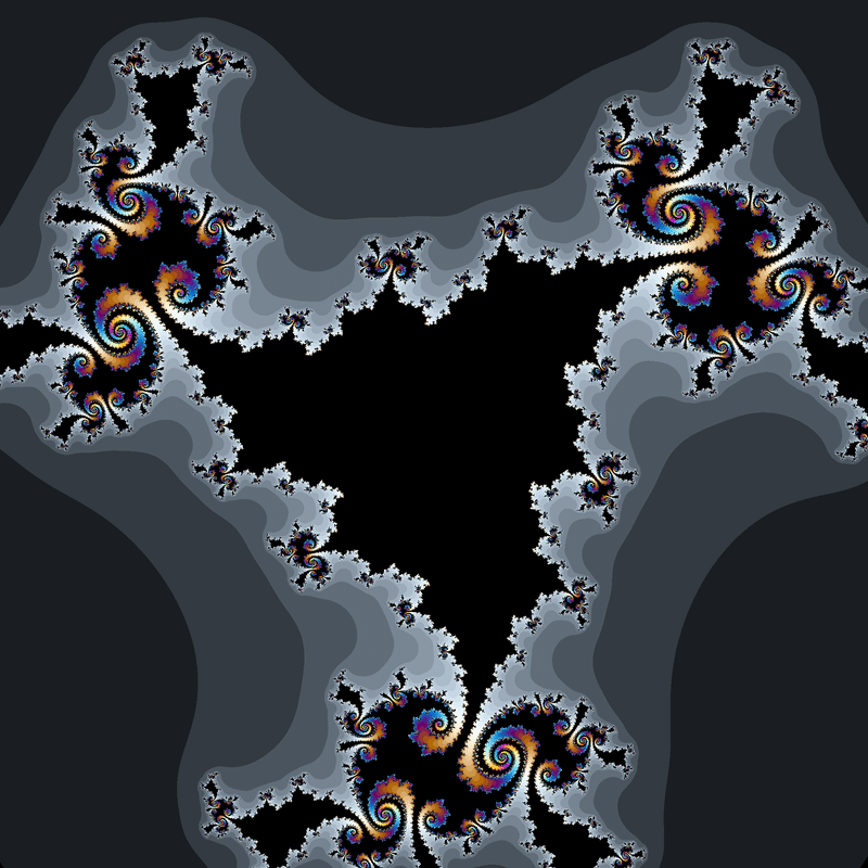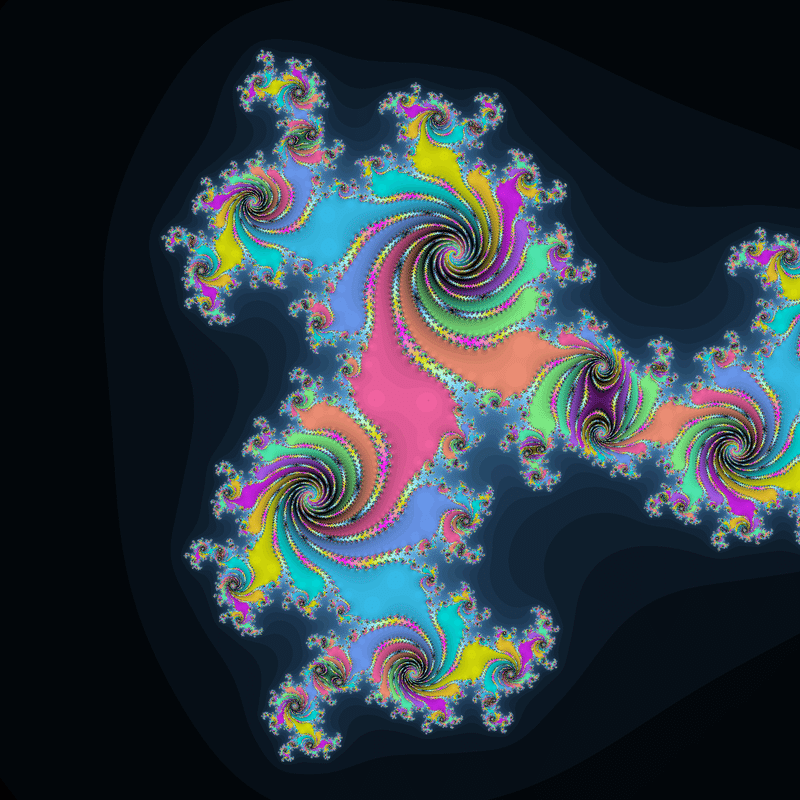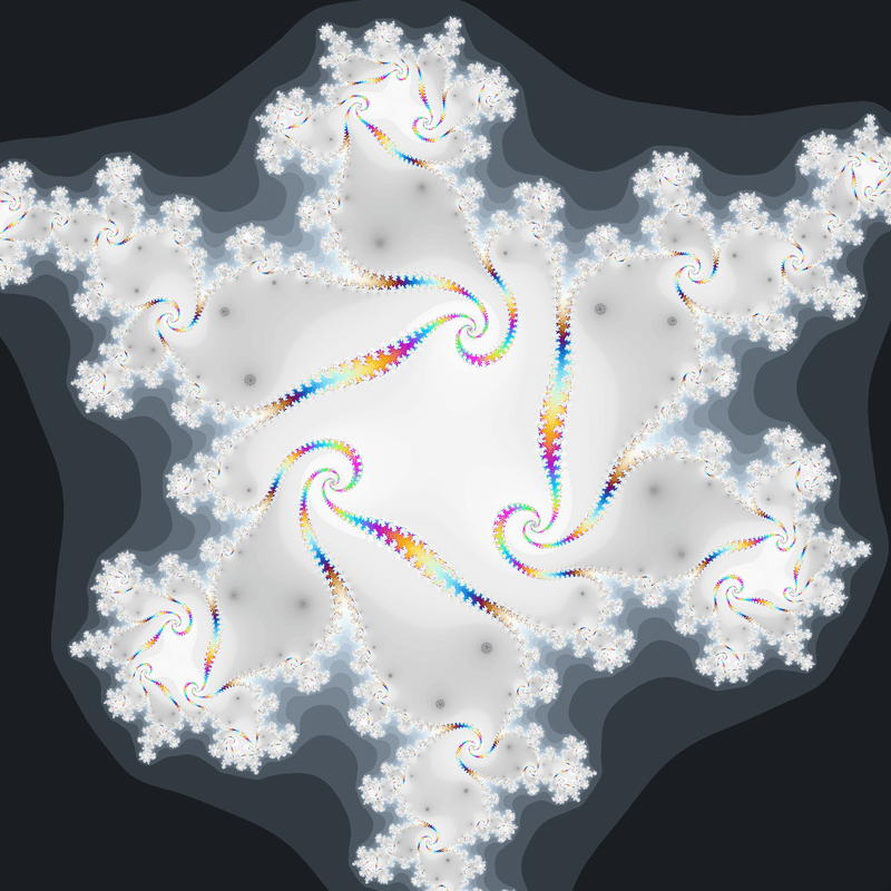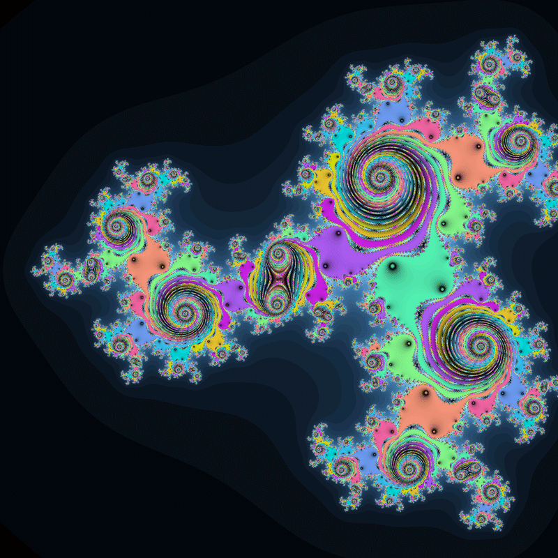 $${z_{n+1}=z_n^2+0.3+0.5i}$$、$${z_0=\underline{c^2+0.1+0.5i}}$$という数列を計算し、発散速度に応じて$${c}$$を彩色する