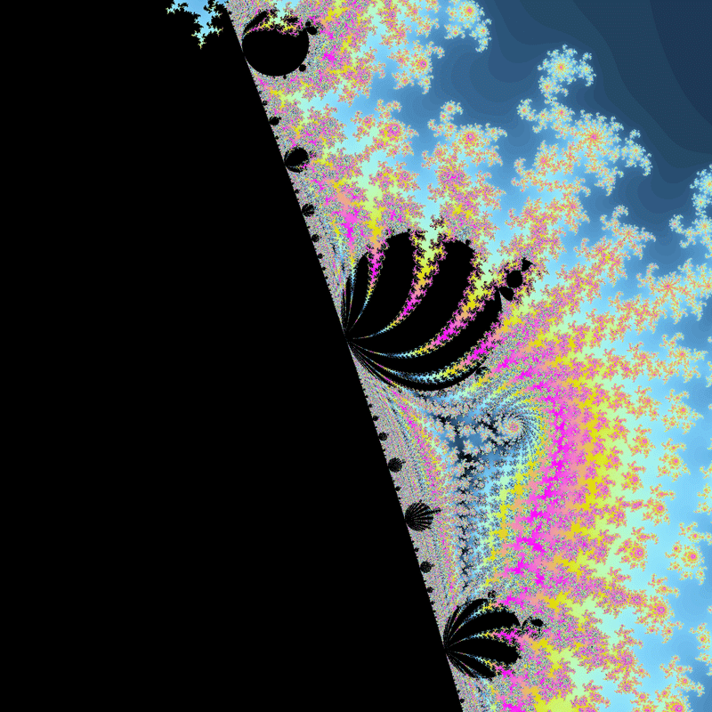 ちなみに、マンデルブロ集合上で変なジュリア集合に対応する場所はこんな感じになっています。