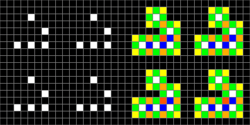 どうやら2番セルは普通のライフゲームと同じ動きをして、1番のセルは周りに2番のセルが出現することがあるので違う動きになるようです。