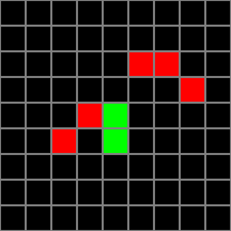 これだけだとライフゲームを模倣しただけですが、縦横1セルずつの間隔に対してズレたセルがあるとライフゲームとの対応関係が崩れます。