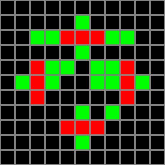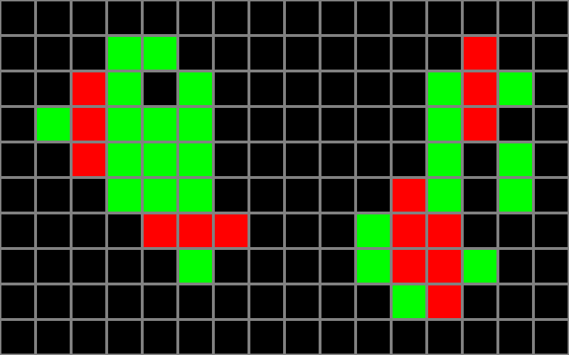 赤いセルがライフゲームと同じ動きをして、その周りに緑のセルが炎のように纏わりついています。