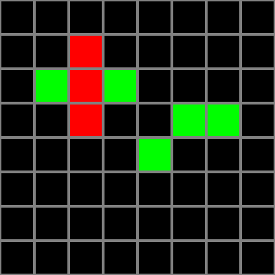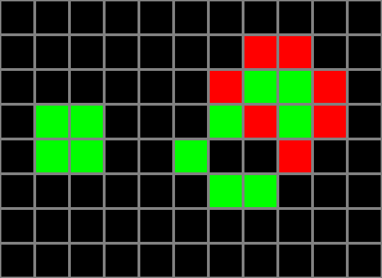 死んだセルが3つの生きたセルと接していたら、生まれたてのセルに変化する