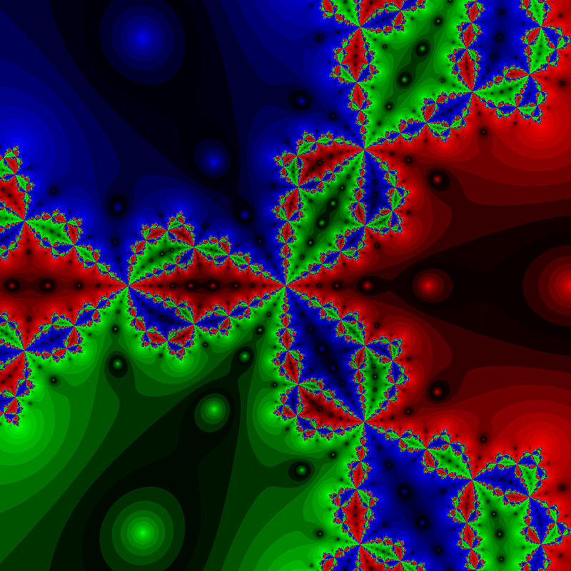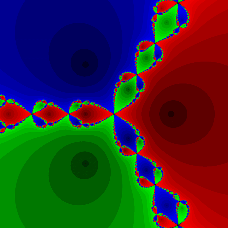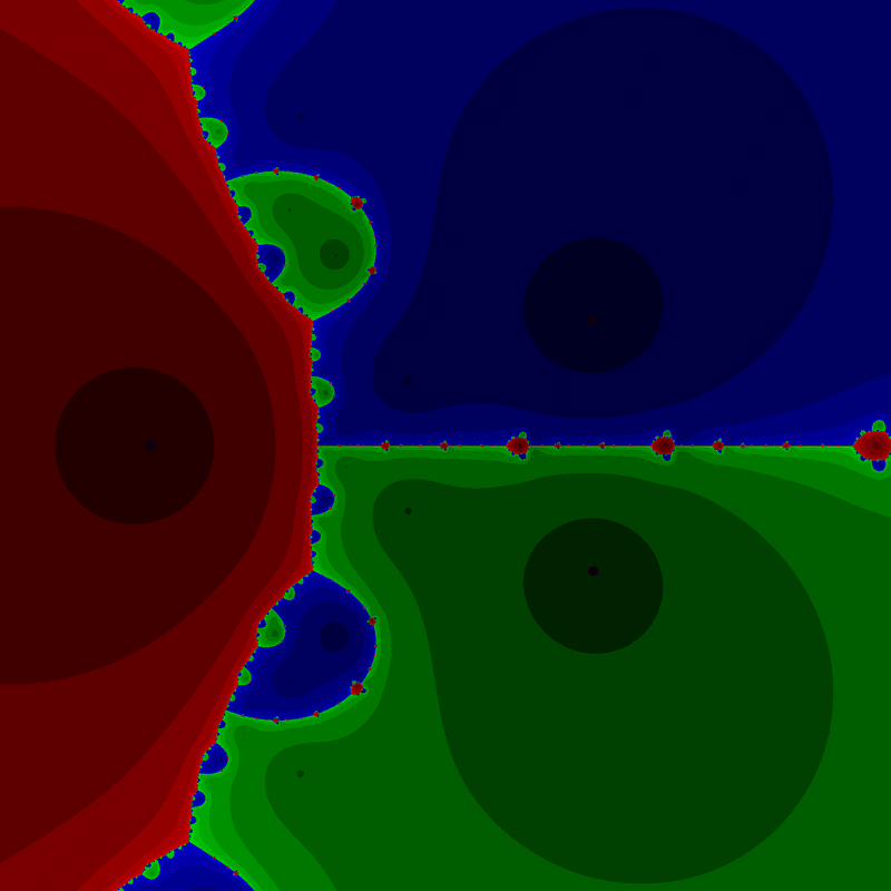 $${x^3-1}$$の根に収束する3色の領域に加え、他の値に収束する黒の領域、カオス的になるノイズ状の領域、無限大に発散する虹色の領域という計6種類の領域が混ざり合っています。