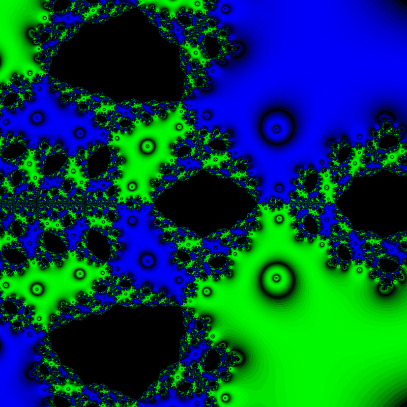右下の緑の領域をよく観察すると、黒い領域がめり込んでいたり、縁の部分が発散領域に切り取られたような形になっており、それらの領域は黒領域・発散領域と混在する値に対応しています。(q=-1.5+0.2iは右側の方の値で、これも青と黒の領域が重なった位置にあります)