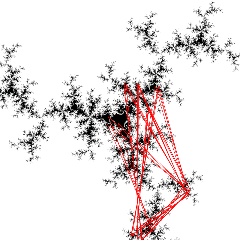 今回の場合、例えば$${c=-6.5+i}$$とすると、$${z_0=1}$$では-0.0626→-0.1551+0.0125i→-0.0789+0.0165iという3周期の数列に収束します。