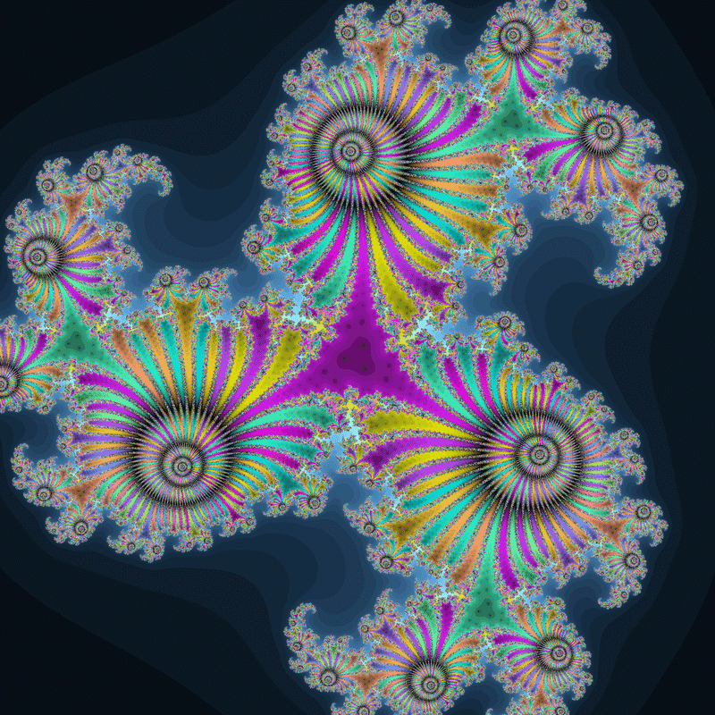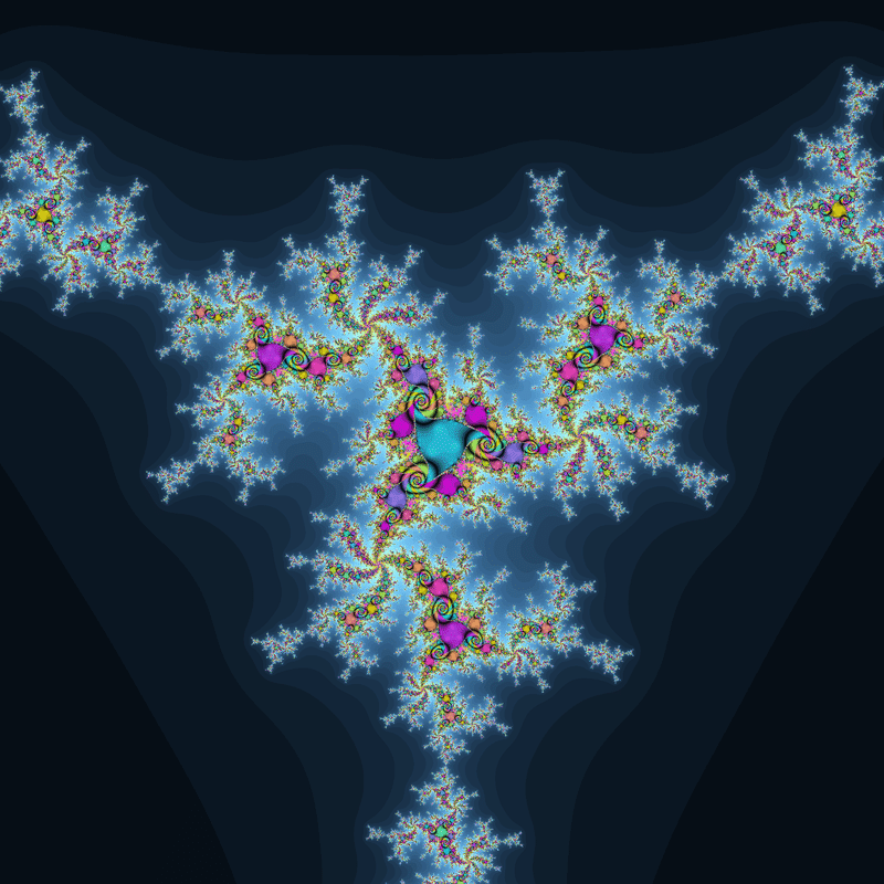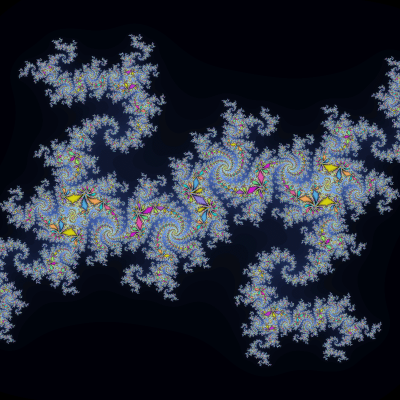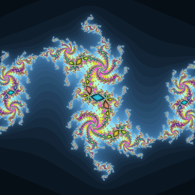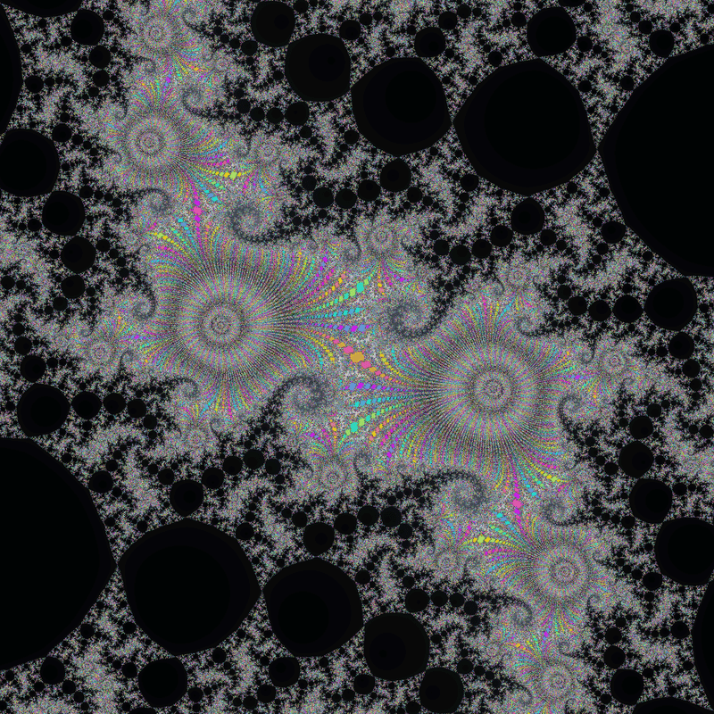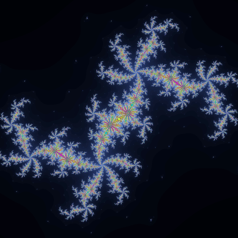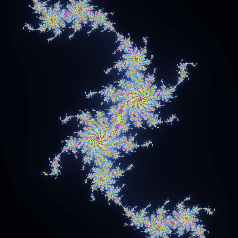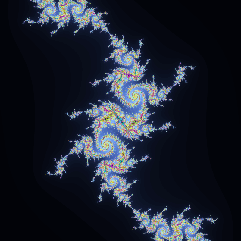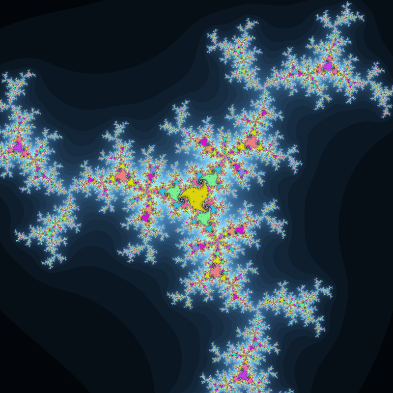 ジュリア集合の内側は周期によって色を決め、収束速度で陰影をつけるようなプログラムで彩色しています。