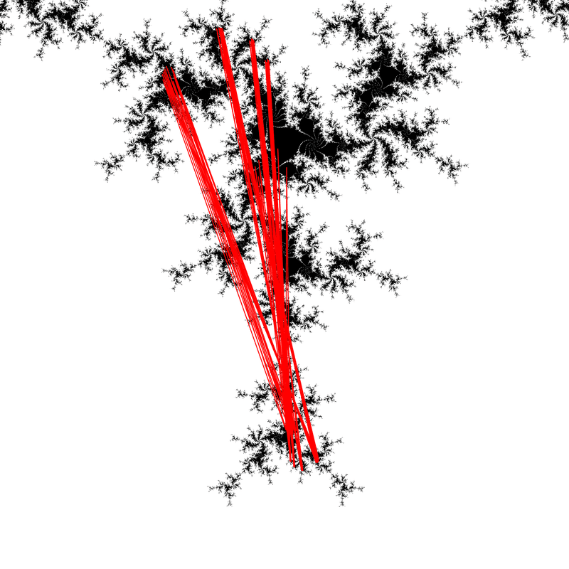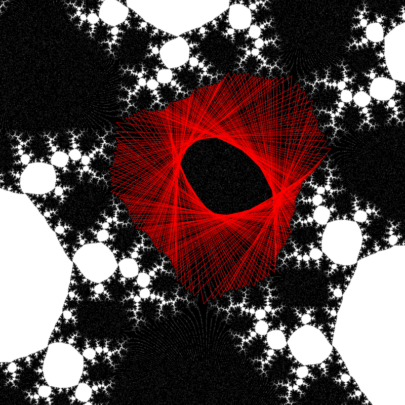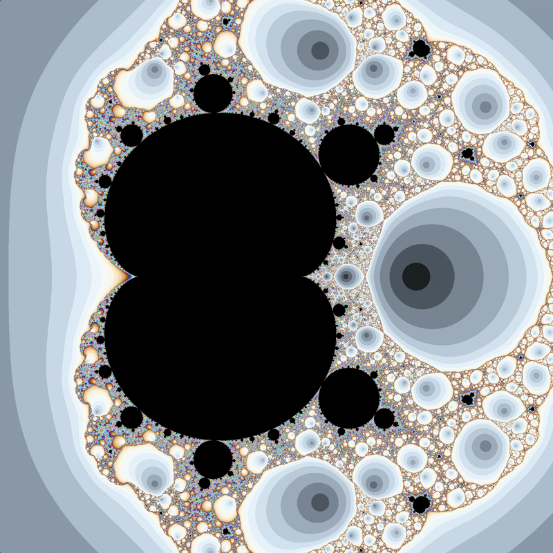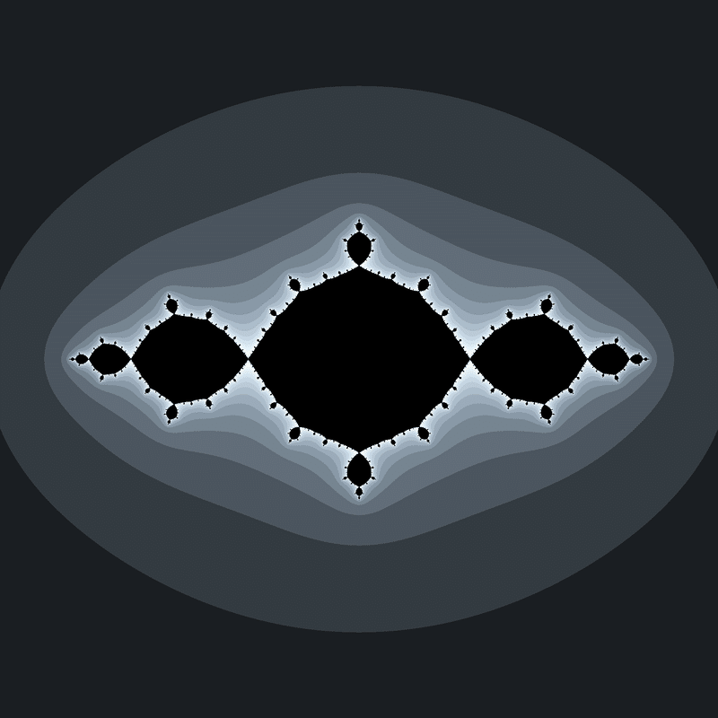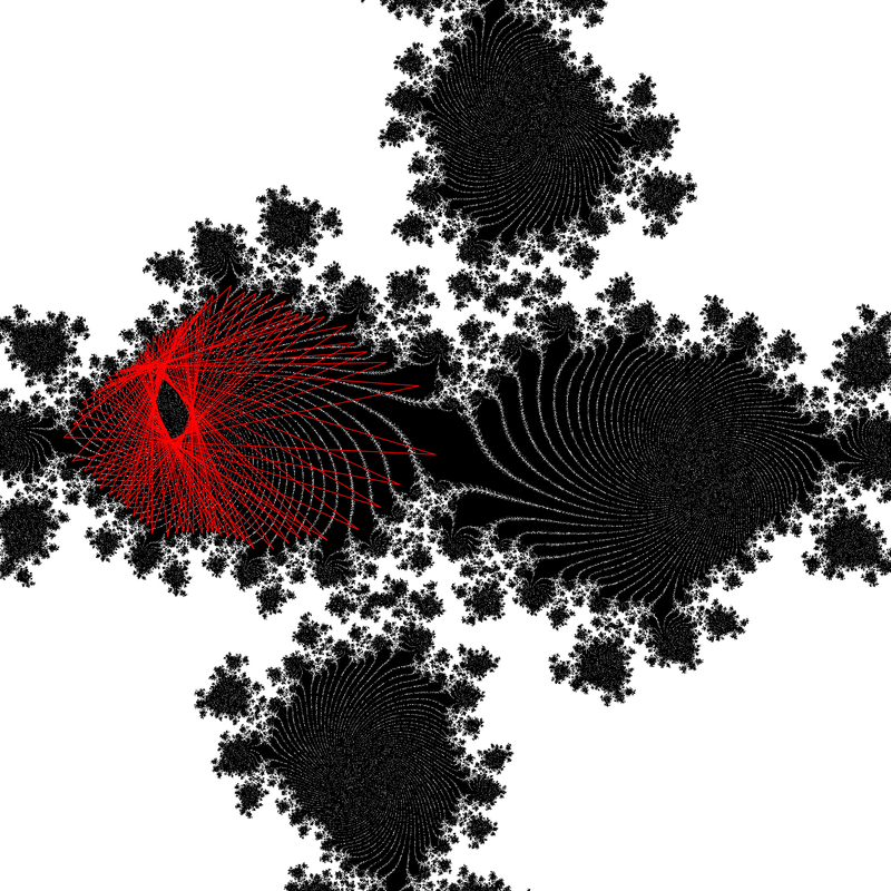 しかし$${\frac{c}{x^2-1}+1}$$は$${x}$$が大きくなってもその値は全然大きくならず、$${\frac{c}{z^2-1}+1}$$のマンデルブロ集合に「外側」があるのは不思議なように思えます。(実際、$${\frac{1}{z^2}+c}$$等の分数関数はほとんどすべての領域で$${z_n}$$が発散しないので今までのものとはかなり異なった見た目をしています)