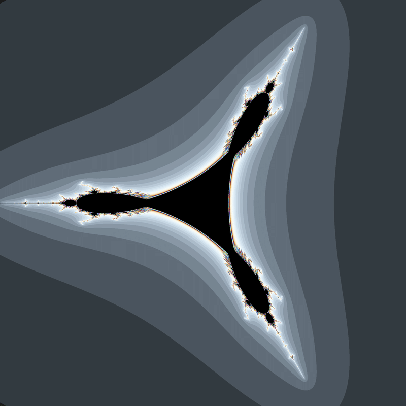 前回取り上げた$${z^2+c}$$や今回の$${z^3+c}$$のような、$${z^n+c}$$という形の関数のマンデルブロ集合のことを、マルチブロ集合というそうです。