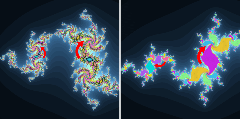一方で、$${z^2+c}$$のジュリア集合の渦巻きの向きはどこでも全て同じになっています。(理由は知りません)