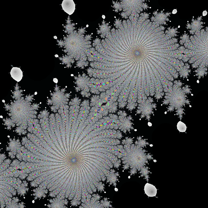 $${\text{con}(z)^2-0.79+0.09i}$$のジュリア集合には渦巻き状の構造がありますが、よく見ると渦の巻き方向は場所によって異なります。