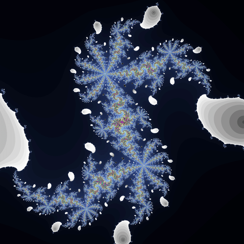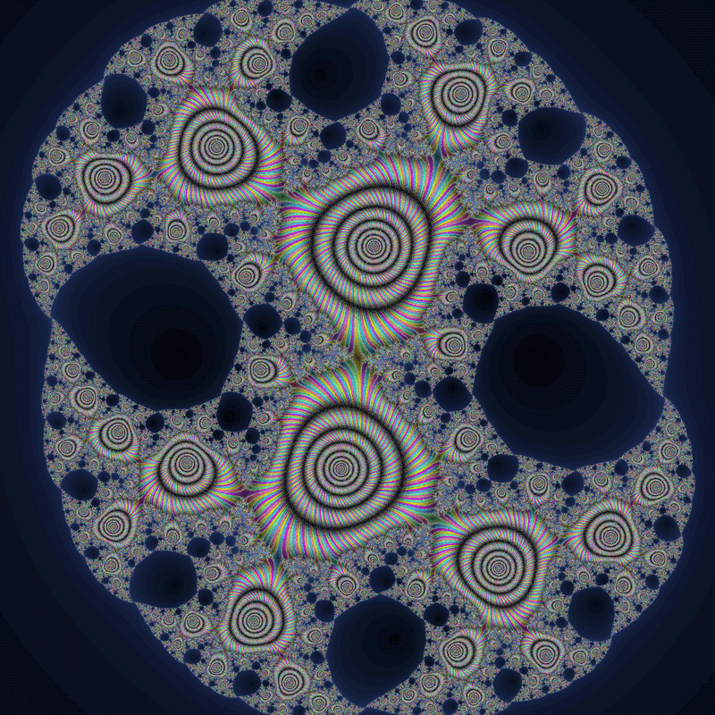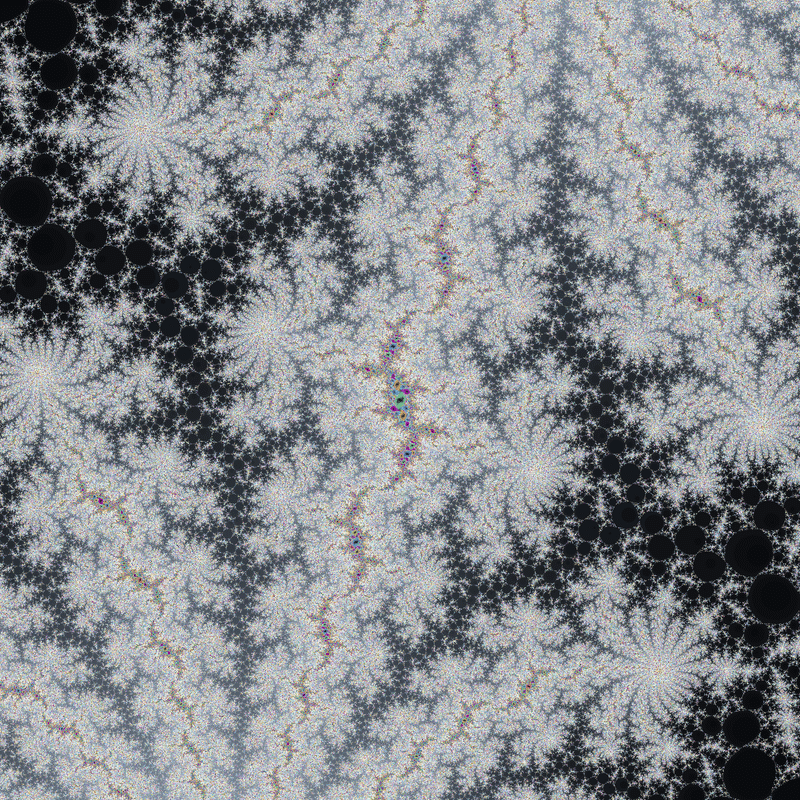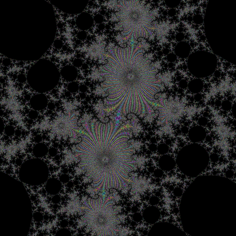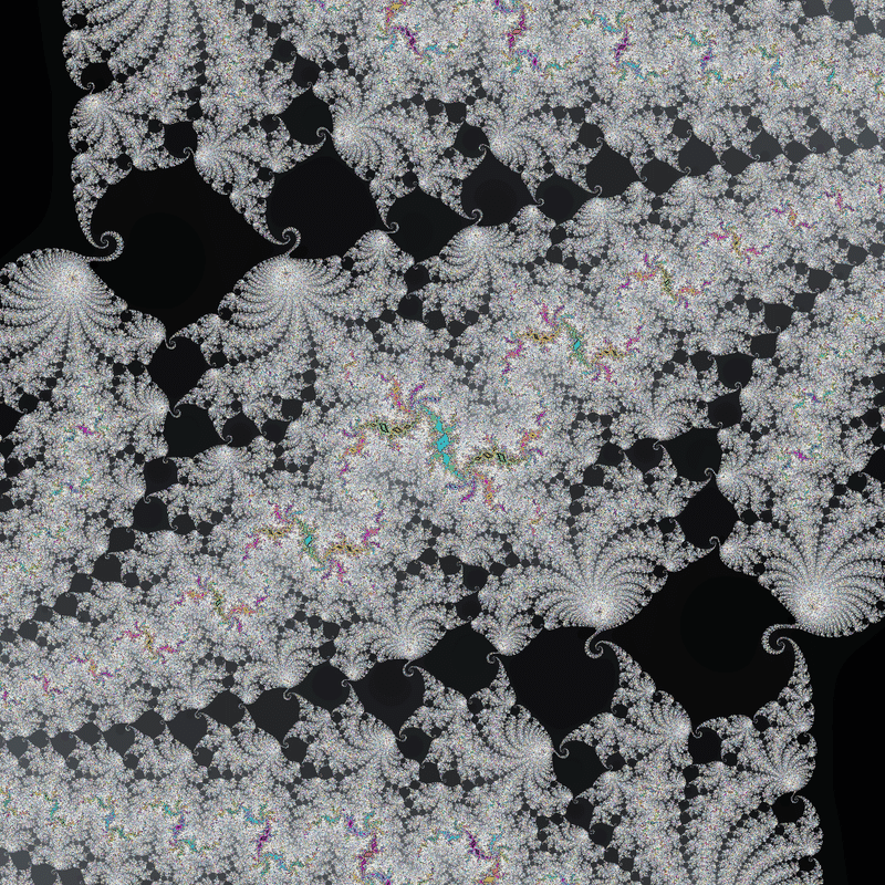 網目状の模様が特徴的ですが、分数関数のマンデルブロ集合では比較的よくみられる特徴です。(多項式関数だとこんな感じにはならないっぽいです)
