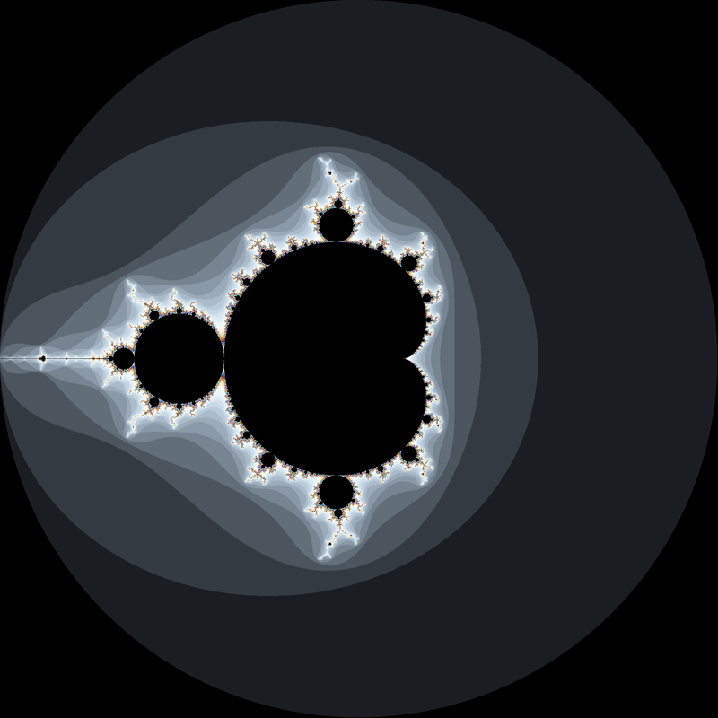 真ん中あたりから左にかけて広がる黒い領域がマンデルブロ集合で、外側の領域は$${z_n}$$が発散するスピードに応じて色が塗られています。