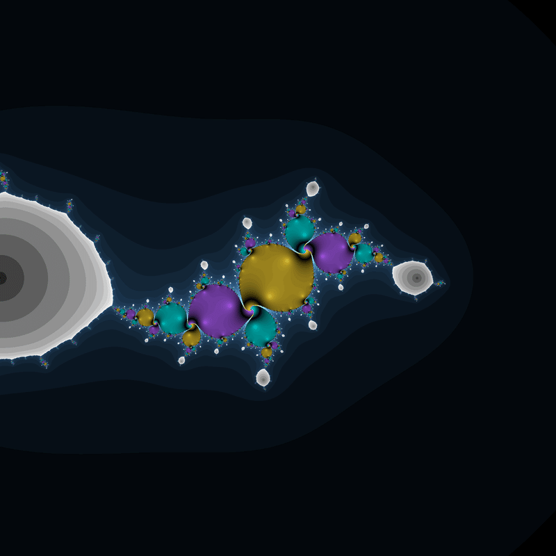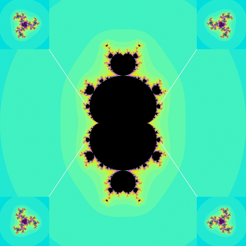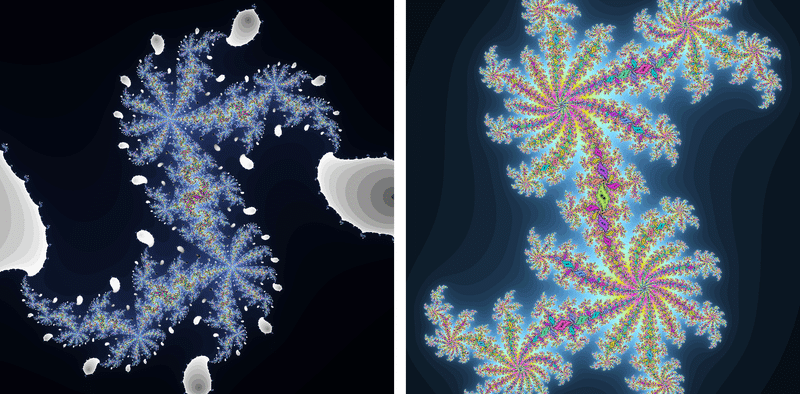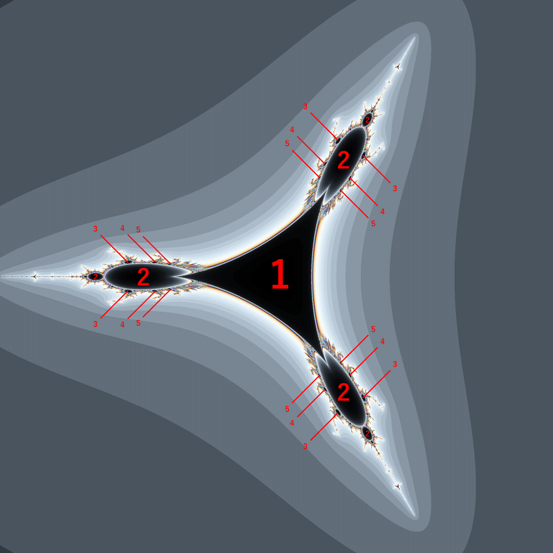 前回の記事で紹介した「レベル」や「周期因子」の話は全てのマンデルブロ集合に適用できる話ではないのですが、少なくともマルチブロ集合の場合は(円状領域という単語が使えないことに気をつければ)ほぼそのまま通用します。