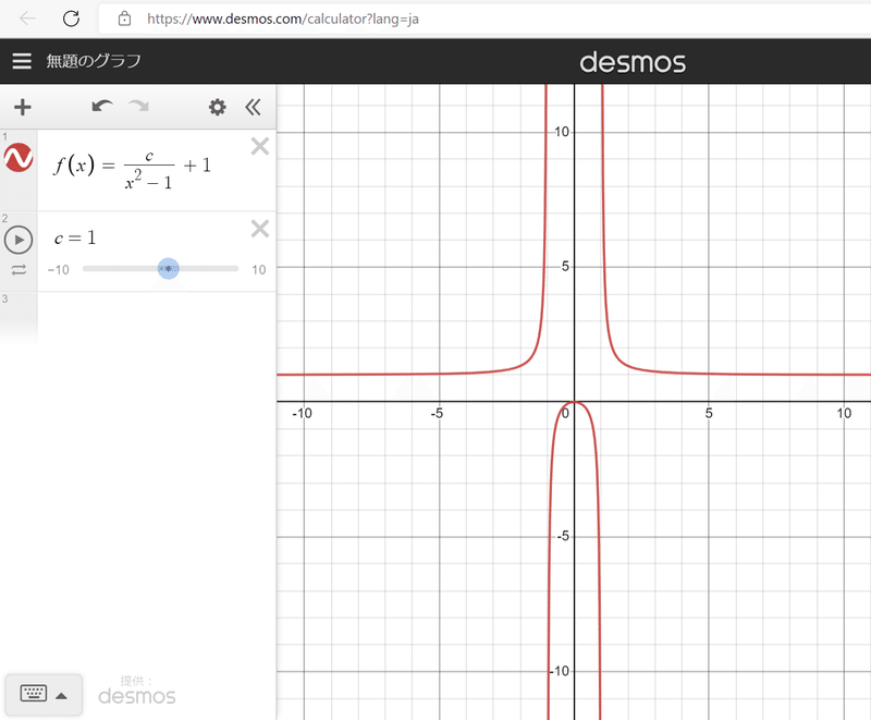 ところで、$${\frac{c}{x^2-1}+1}$$のグラフを描くと以下のようになります。