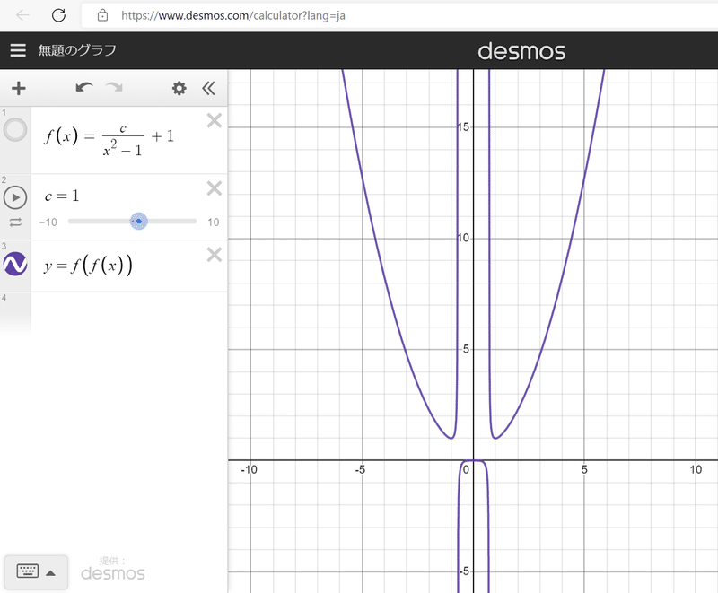 実は$${f(x)=\frac{c}{x^2-1}+1}$$という関数は発散しにくそうでも、$${f(f(x))}$$は2次関数のような形になり$${x→\infty}$$で発散していくのです。