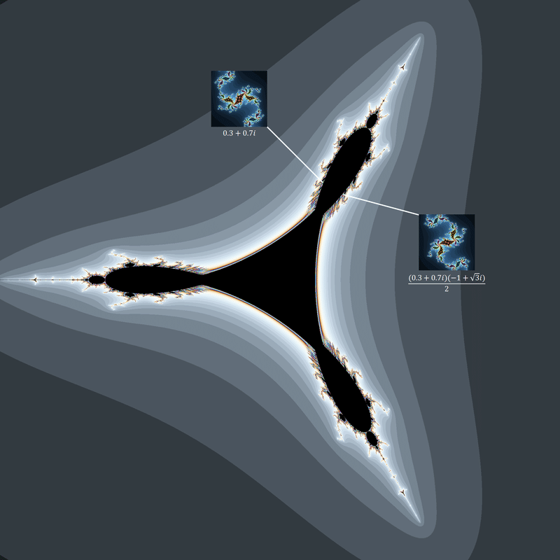 例えば$${c=0.3+0.7i}$$に対して斜めの対称軸について線対称な位置にある点を頑張って計算すると$${\frac{(0.3-0.7i)(-1+\sqrt{3}i)}{2}}$$になるのですが、この2つの値は全く同じ周期・形のジュリア集合を生成します。