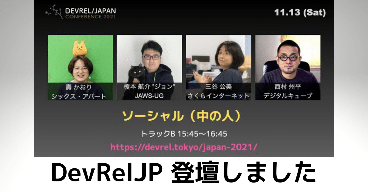TL;DRDev/Rel Japan CONFERENCE 2021にパネリストとして登壇してきました、という活動報告となります。 DevRel/Japan CONFERENCE 2021とはセッション概要どういうネタで登壇したの? 登壇させて頂いたセッションは、「ソーシャル(中の人)」というお題目で、企業や団体さんが運営されているSNSの、「中の人」が集まったセッションでした。 私は、JAWS-UG(Japan AWS User Group)のソーシャル中の人として活動
