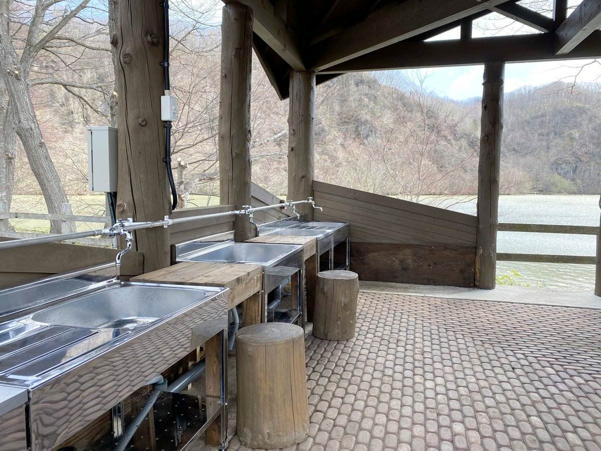 炊事場にはシンクが5つあり、混雑を気にすることなく利用することができます。湖を眺めながら気持ちよく洗いもの・片付けができちゃいます。
