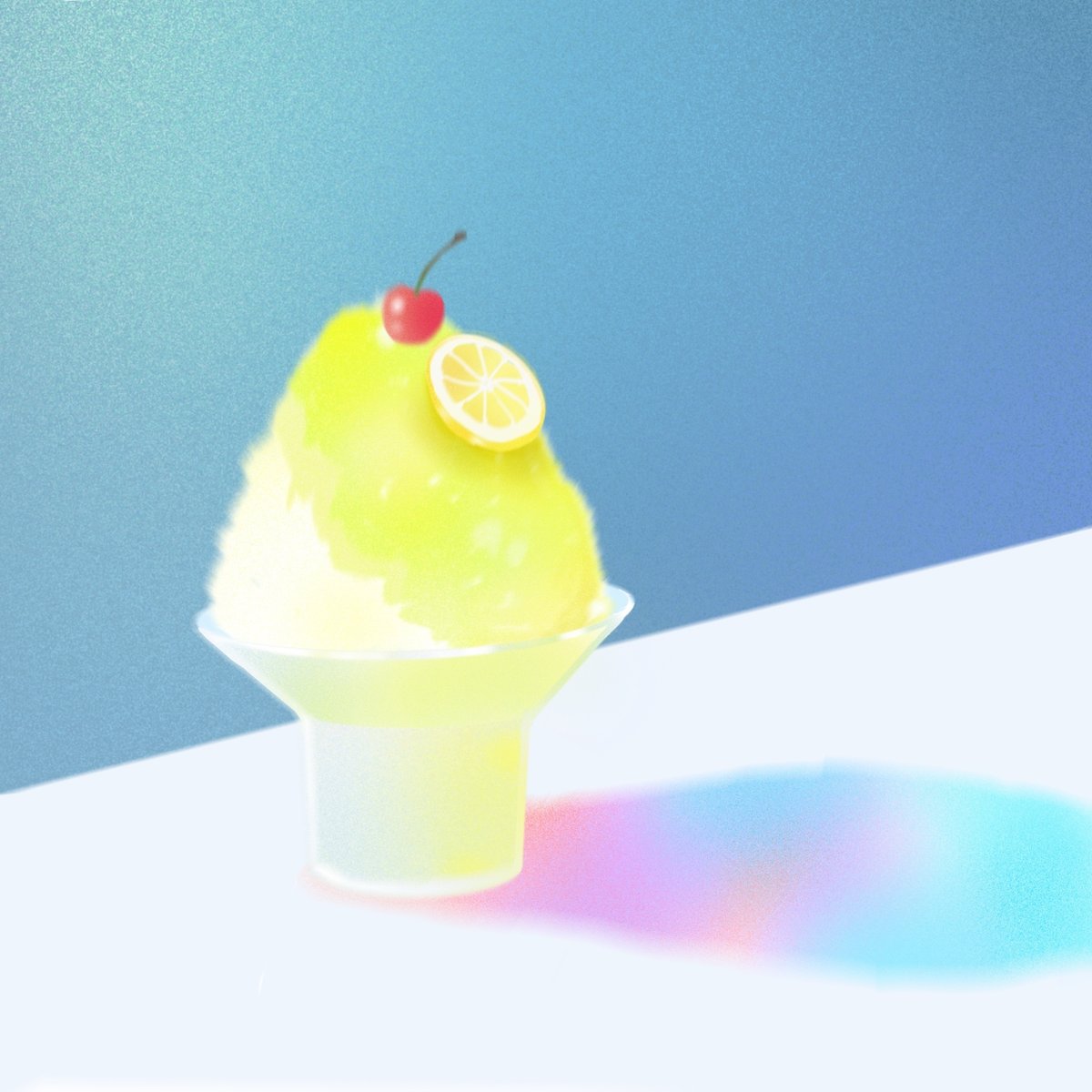 今食べるなら爽やかなレモン味がいいかなという気持ちでレモン色のかき氷を描きました。