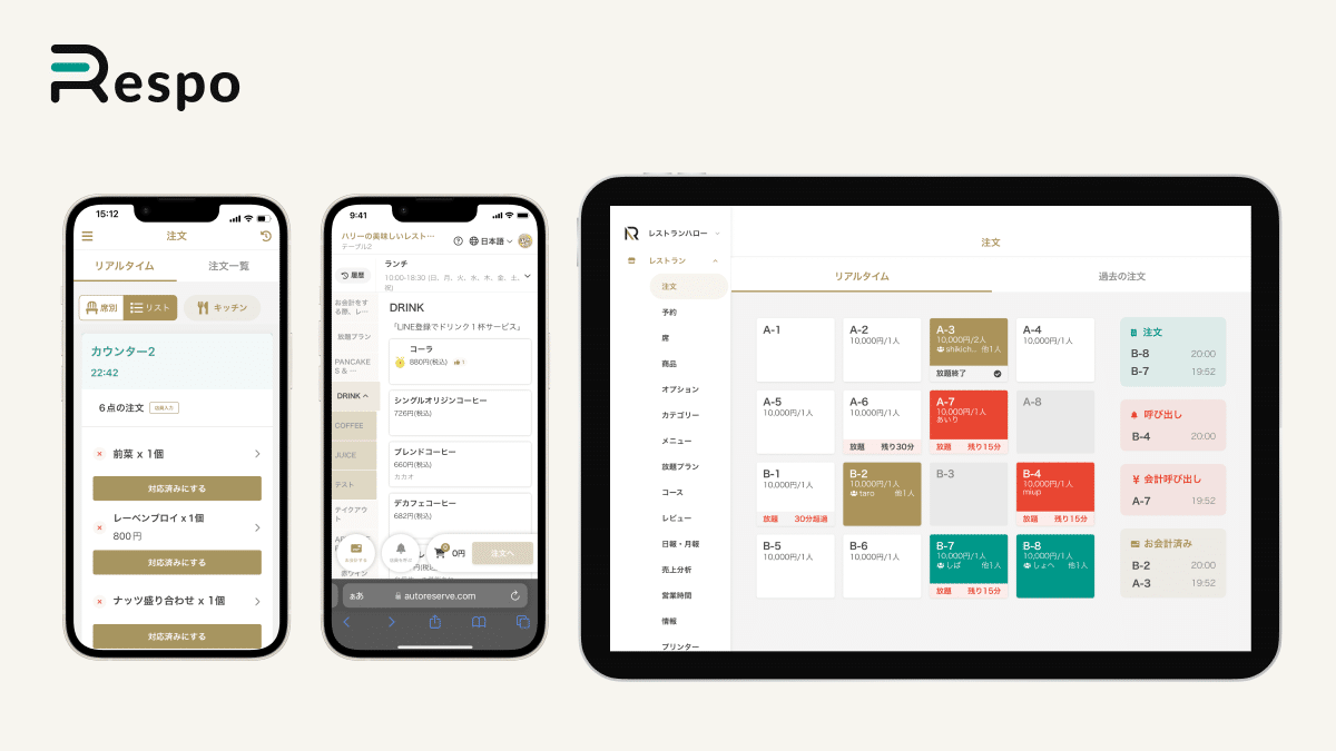 Respoは、株式会社ハローが提供する飲食店向け業務支援サービスで、予約管理・注文受付・会計・売り上げ分析などの業務をデジタル化することによって、飲食店運営における業務をオールインワンで効率化しコストを削減することが可能です。