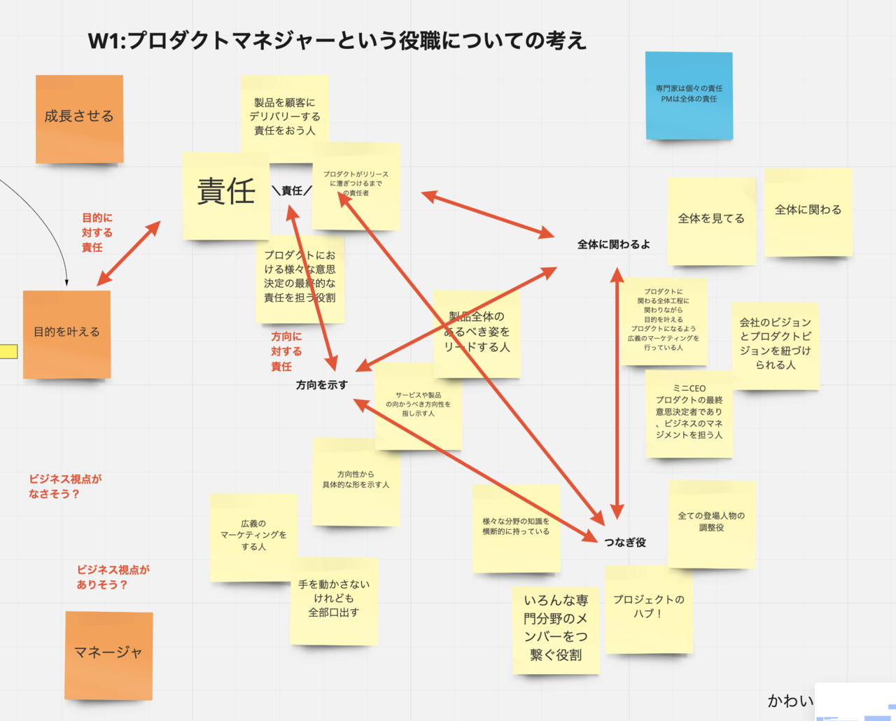 全14章あるこの本を読み進めるにあたり、前提がずれていると話が噛み合いません。オンラインホワイトボード、Miroを使って「自分の考えるプロダクトマネジャーとは」を黄色い付箋で書き込んでもらいました。