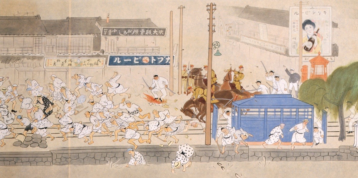 これは非暴力的な抗議だったのですが、新聞が「女一揆」などと取り上げて報道したことから、たちまち全国に知れ渡り、各地で反響が広がって、ついには暴力的な争乱まで起こっていきます。