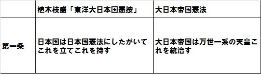 ここで、この「東洋大日本国憲按」と、実際に明治の日本で制定された「大日本帝国憲法」とを、それぞれ第1条だけ比べてみましょう。第1条だけでも、発想の違いがよくわかります。