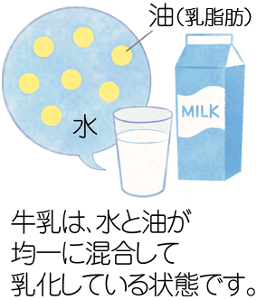 牛乳は水の中に乳脂肪がフヨフヨ分散しているのだけれど、この時水と乳脂肪の界面にいるのは、リン脂質やカゼインのようなタンパク質になります。リン脂質は、私たちの細胞の表面を構成している自然な物質の1つですね。