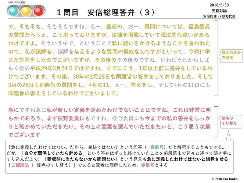また、最終段落は、「急に定義したわけではない。だから、卑怯ではない」と質問を否定する回答(=青信号)だと解釈することもできる。だが、「自分が関係していたら辞める」という答弁はずっと続けていたことを前段落まで延々と述べて、すり込んだ上で、「贈収賄に当たらないから問題ない」という発言も急に定義したわけではないと錯覚させる「ご飯論法」であると筆者は理解したため、赤信号とした。