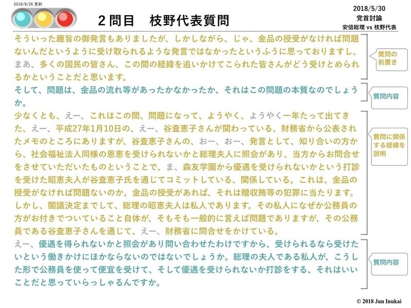 2段落目で質問内容である森友問題の経緯を振り返ったため、黄信号が多いが、後半は質問内容になっている。この質問内容を端的に要約すると、以下のようになる。