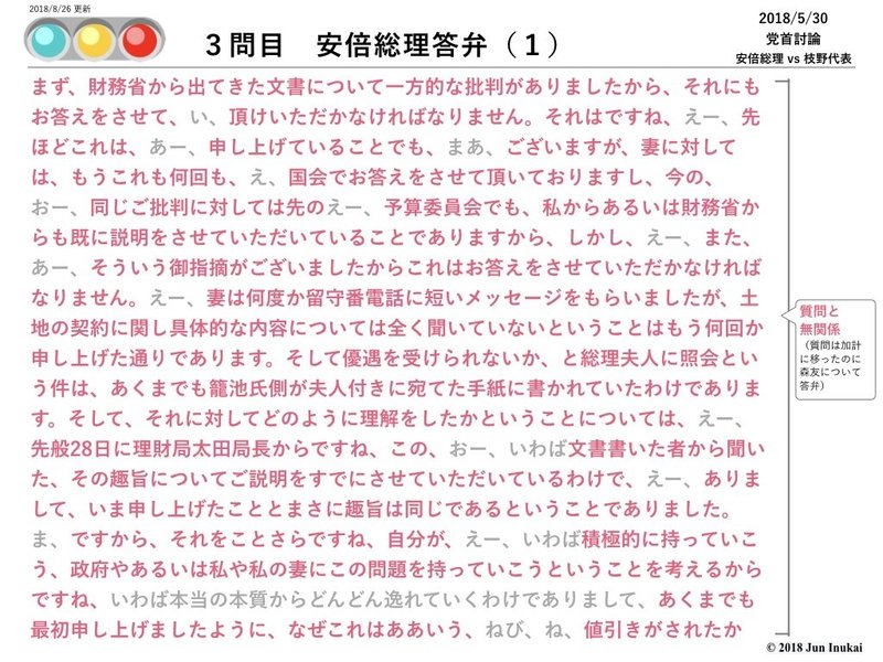 まず、冒頭の1段落目は筆者が何度読んでも、どうしても意味を理解できなかったため、灰色(=意味不明な言葉)と判定させて頂いた。他は黄信号(=質問の背景を説明)、赤信号(=野次への返答、論点すり替え)が大半を占めている。