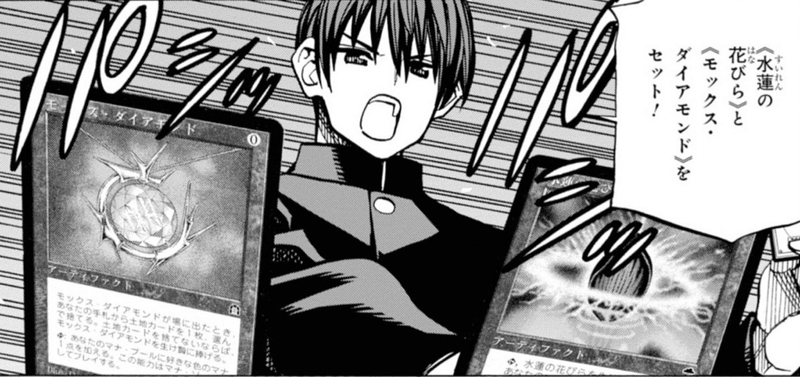 回想シーンではじめと来島が読んでいるのは、『基本セット第五版』入門セット付属のプレイガイドとスターターデッキ付属の小冊子。小冊子のほうは渡辺謙もブチギレるほど字が小さく、当時『マジック:ザ・ギャザリング』をはじめた小中学生の約半数がここで挫折したとかしなかったとか。