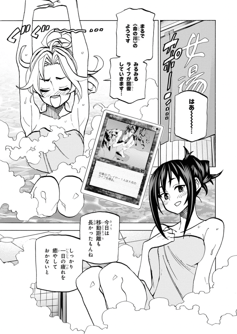 読切のころから、新出の『マジック:ザ・ギャザリング』関連用語にはかならず注釈をつけるようにしています。もちろん未経験者への配慮からそうしているのですが、これがなかなかなくならない。この巻収録の第38話で、ようやく注釈がゼロになりました。