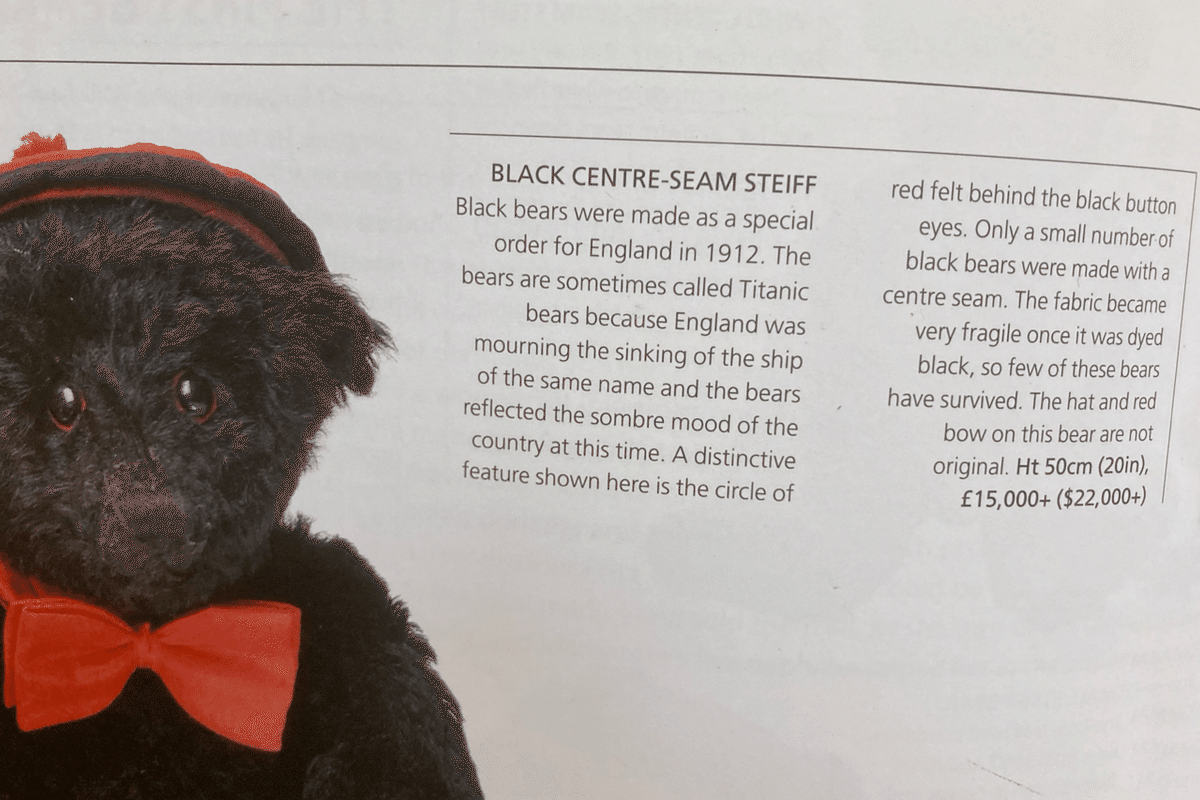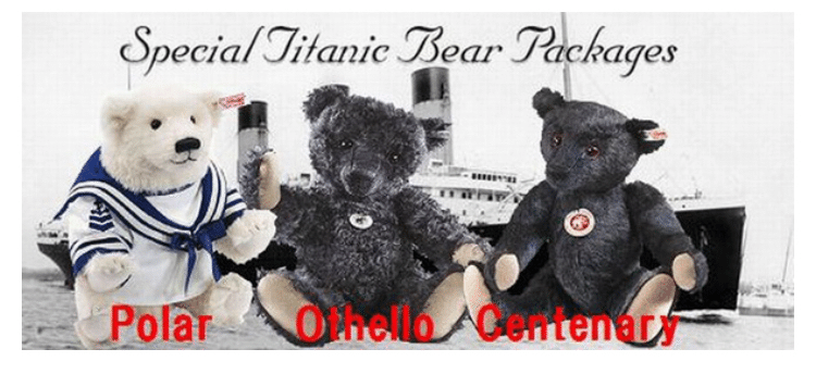 1912年にタイタニック号の沈没を受けて、ドイツのシュタイフ社は哀悼の意を込めイギリス限定の黒いテディベアを作りました。(事故が起きる前は英国限定として明るい色のモヘアのベアで発売予定でした)