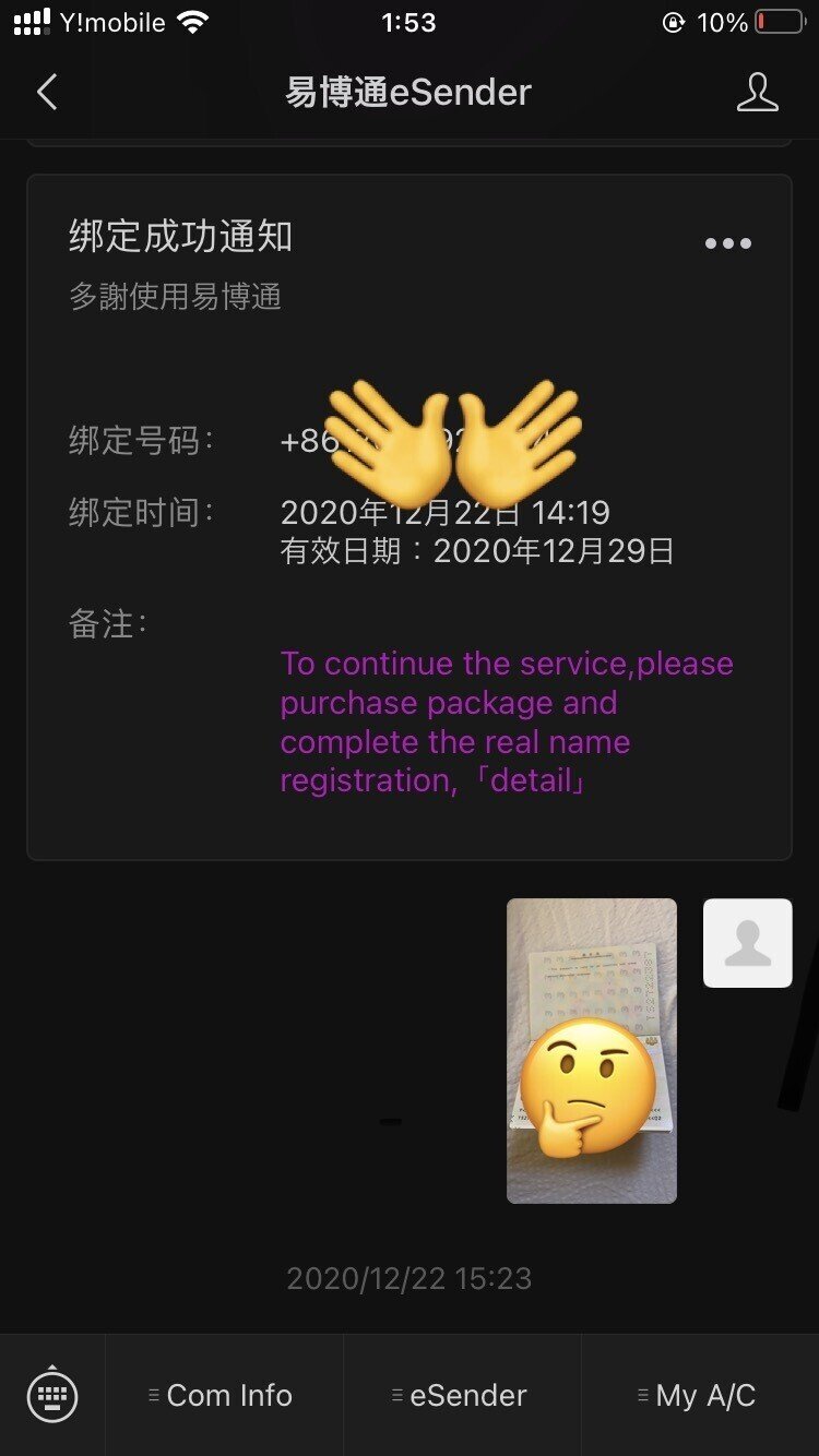 WeChatを使ってeSenderという中国のSMS用の電話番号を取得できるサービスを利用します。