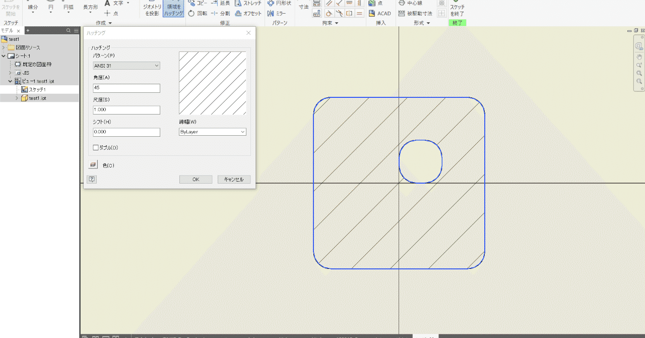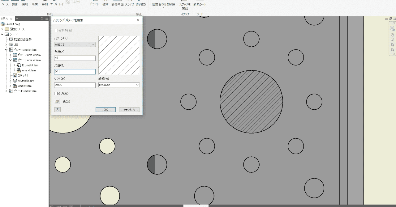 Inventor2018の2D図面で、断面のハッチング(網掛け)の尺度を変更して細かさを変更する方法。