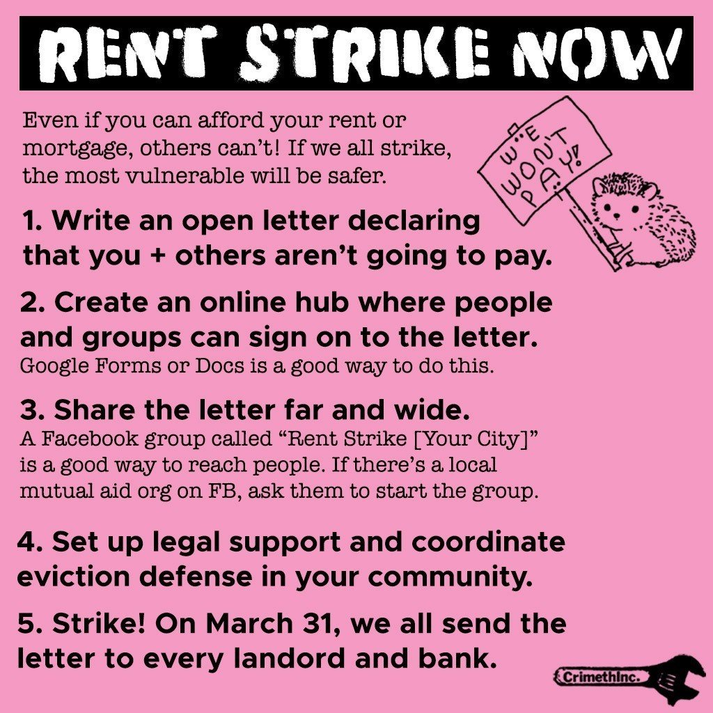 このアイデアはすでに様々な形で世界を駆け巡っている。オーストラリアのメルボルンでは、世界産業労働組合の地域支部がCOVID-19家賃ストライキ宣言を推進しているし、ローズ・コーサスは家賃、住宅ローン、光熱費の支払いを停止するよう呼び掛けている。同じ呼びかけをシアトル家賃ストライキがワシントン州で出している。シカゴの借地借家人はオースティン、セントルイス、テキサスの人々と共に家賃ストを行うぞと(地主たちに)脅しをかけている。カナダでは、トロント、キングストン、モントリオールで組織化が進んでいる。また他にも、家賃と住宅ローンのストライキを呼び掛ける文章が出回っている。