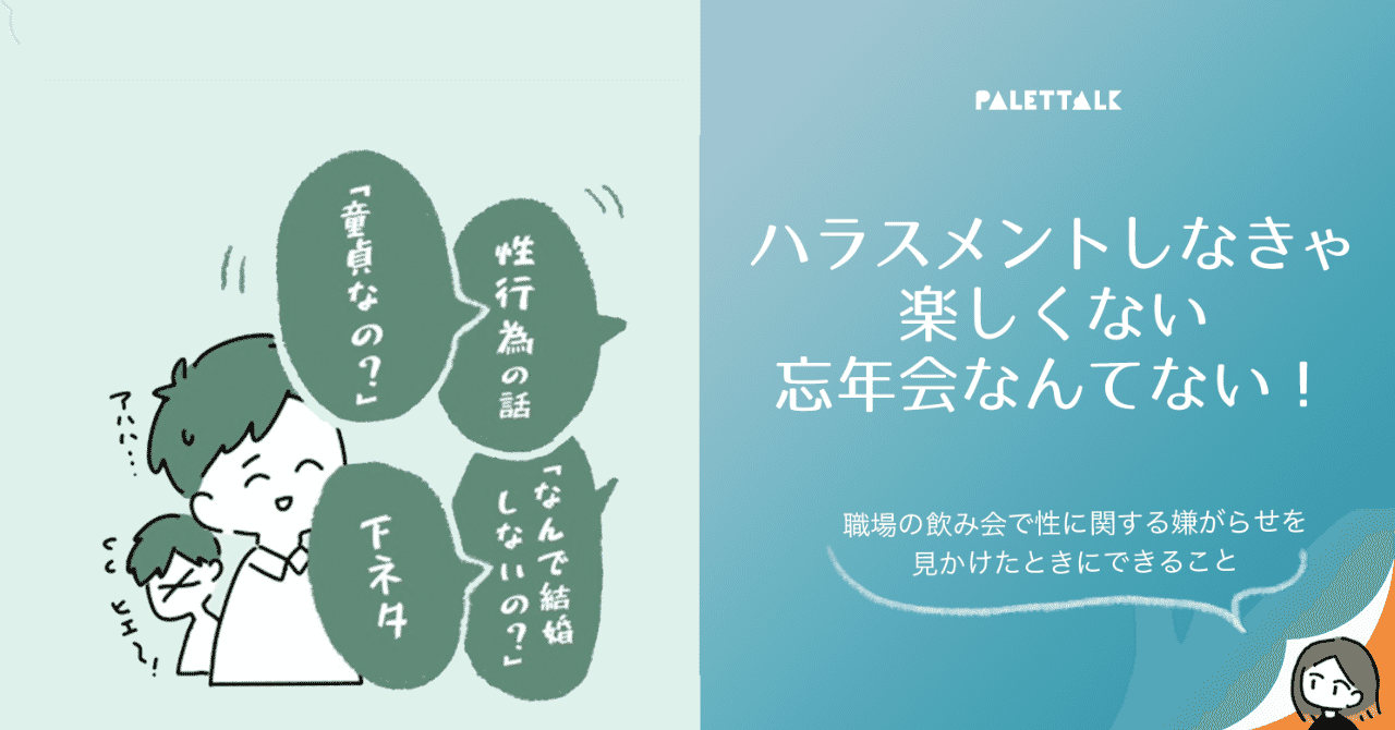 そして、そんな季節だからこそ気になるのがハラスメント。とくに職場の飲み会では、関係性上、ハラスメントが起きていても指摘しにくい状況も多い。
