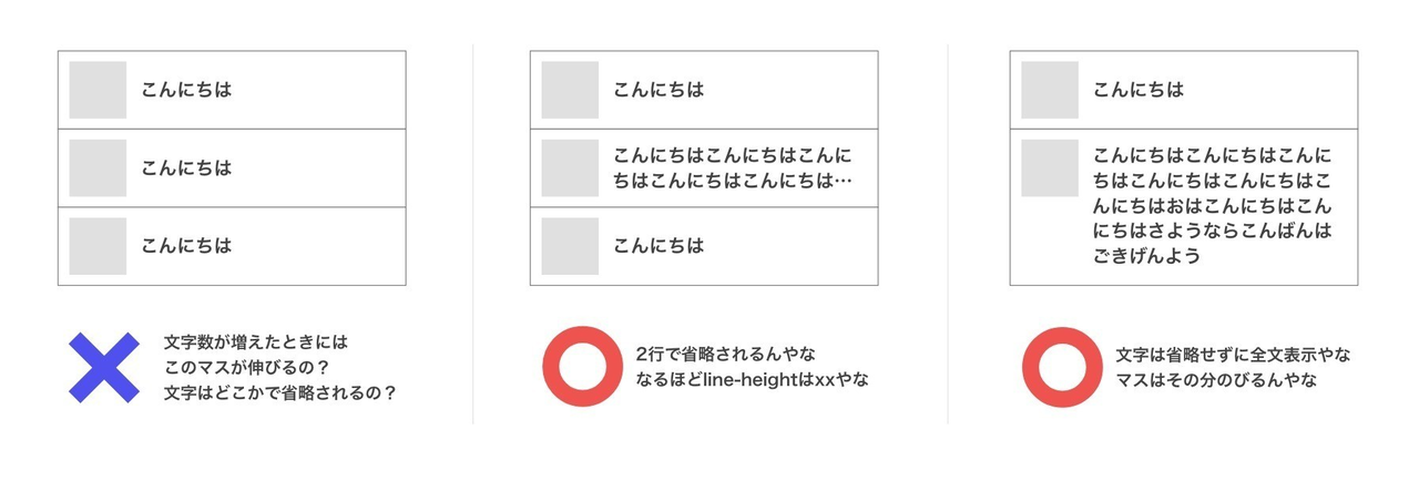 せっかく同じタイプのUIコンポーネントが複数並んでいるのですから、うまく利用して欲しいです。長い文章のときは最大で2行まで表示するのか、全文表示させるのかまでわかるとエンジニアからの質問が一つ減ります。