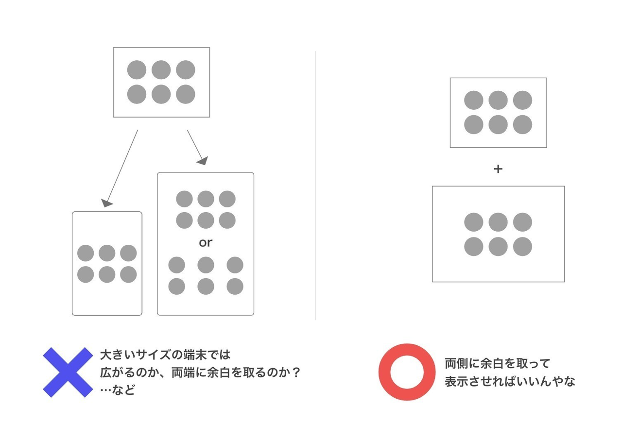 画像の通り、大きくなったときに要素間が広がるのか、まわりの余白が大きくなっていくのかはエンジニアでは判断がつかないケースが多いです。