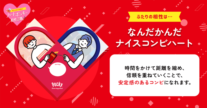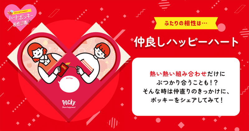 相性診断は1月10日から店頭でポッキーを購入すると、パッケージにあるQRコードから読み取って相性診断することができます。さらに、「未来のメッセージ」「絆がもっと深まるハピネススポット」「ハピネスアドバイス」など、より詳しい診断結果が見られるので、お楽しみに!
