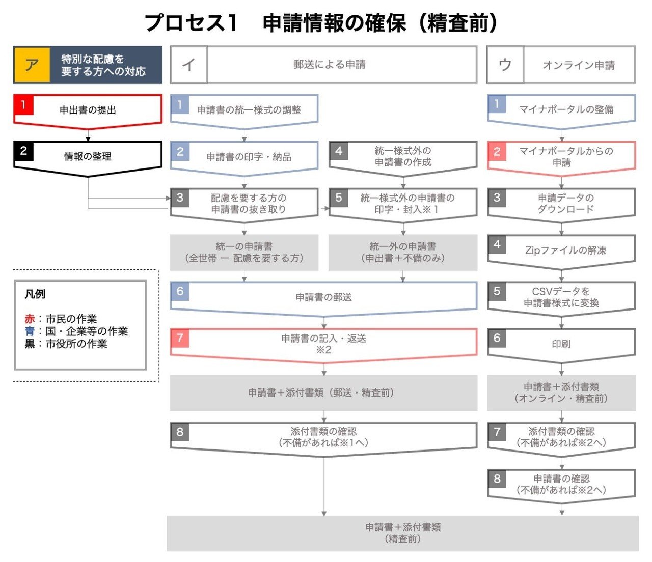 まずは、全世帯に送付する申請書の様式を固めます。全体最適型では、住民基本台帳システムを構築した事業者が作成する統一様式を使用します。