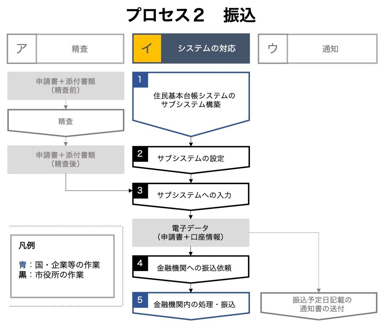 対象世帯が数百件程度までであれば、申請情報をもとに職員自らで金融機関に振込を依頼できるかと思いますが、万単位となるとさすがに現実的ではありません。そのため、システム上で対応していきます。