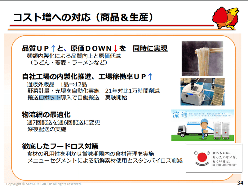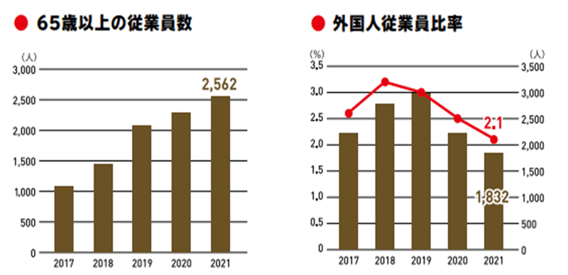 実際にシニアスタッフ、外国籍スタッフの数も開示されています。高齢者はグングン伸びてますね。外国籍はコロナの影響もあってか減少はしています。(ただし、後述するように海外展開を進める中では、オペレーションを統一化するという観点ではロボットは有効に機能しそうです)