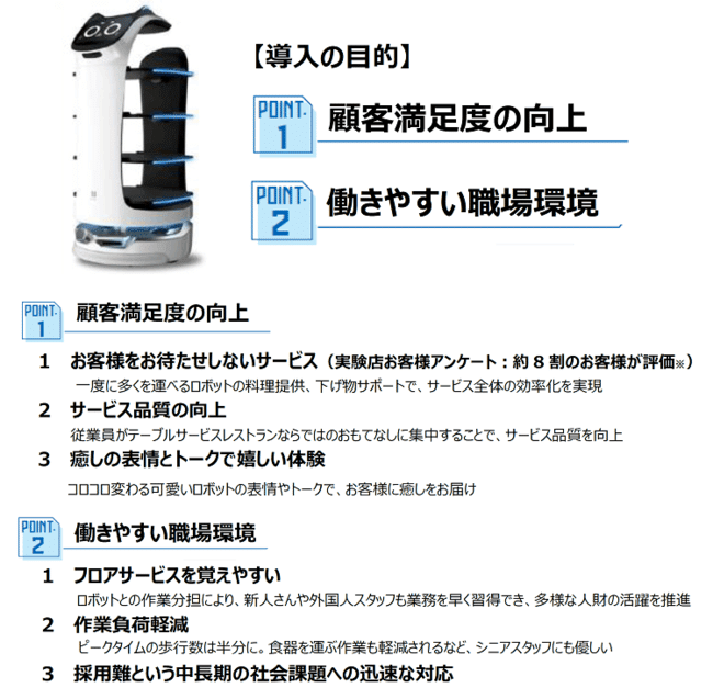 特に、②の働きやすい職場環境というのは、現実的には切羽詰まった課題でもあるようで、「特にシニアスタッフにおいては、ロボットによる配膳により、作業が軽量化され負担が軽減されます。また、業務の難易度軽減により外国人スタッフの活躍も推進でき、多様な人財が働きやすい職場につながっています」という記載もありました。