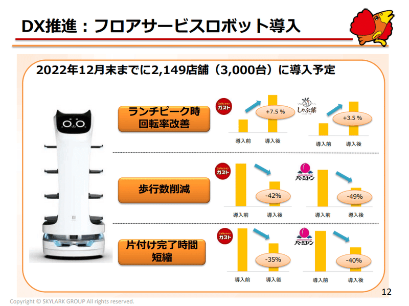 内容としては、12月27日に 「ガスト」「しゃぶ葉」「バーミヤン」をはじめとする全国約2,100店舗に3,000台のロボットの導入を完了!!